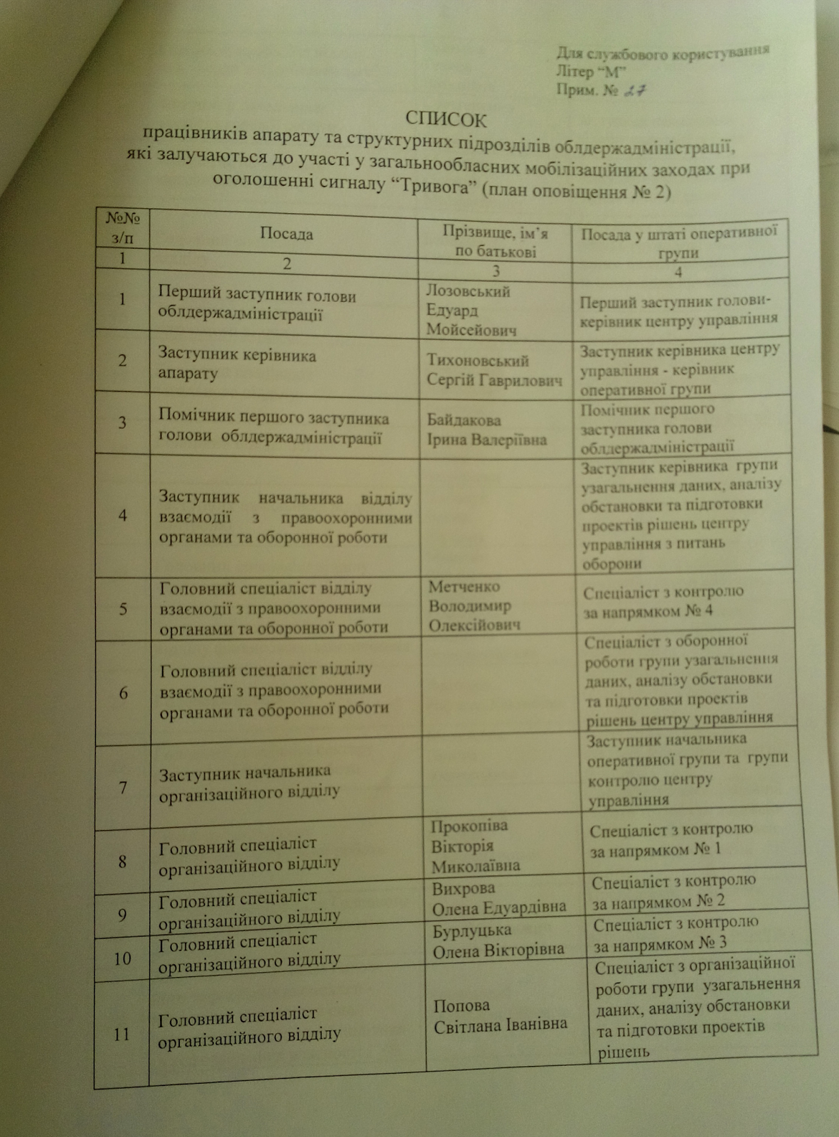 Это список «Литер М», лиц, ответственных за мобилизацию сотрудников ОГА, защиту здания и другие мероприятия по сигналу «тревога». Именно к этой группе стекалась вся информация о перемещениях украинских силовиков (ВВшников, милиции, СБУ, военных, пограничников) по всей области. Именно они могли (при желании) предотвратить захват здания…